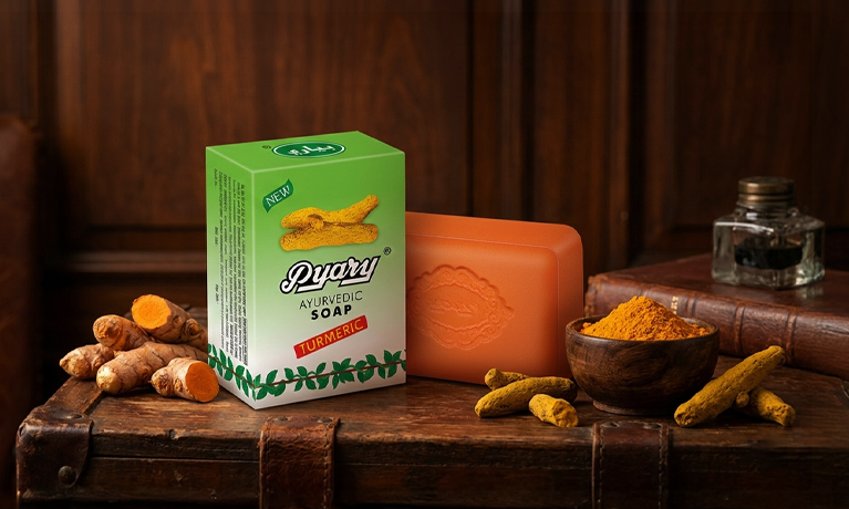 Mixed with coconut oil, the Pyary Ayurvedic Toilet Soap comes across as the most aromatic skin protector whose silky lather soothes even the most sensitive skin. Turmeric contains essential oil, curcumin oil and is an indispensable ingredient in certain skin care preparations. Besides external application turmeric is also administered internally as stimulant and it is absolutely harmless natural ingredient. Every cake of Pyary Soap passes through rigourous quality control tests. The peerless home-spun manufacturing system ,based on through experience uses blending methods that retains the glycerine contents and ensure soft-lathering properties.